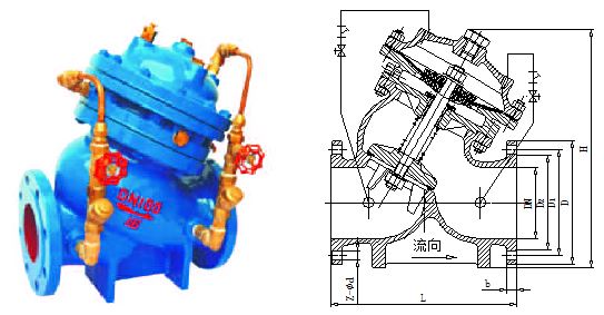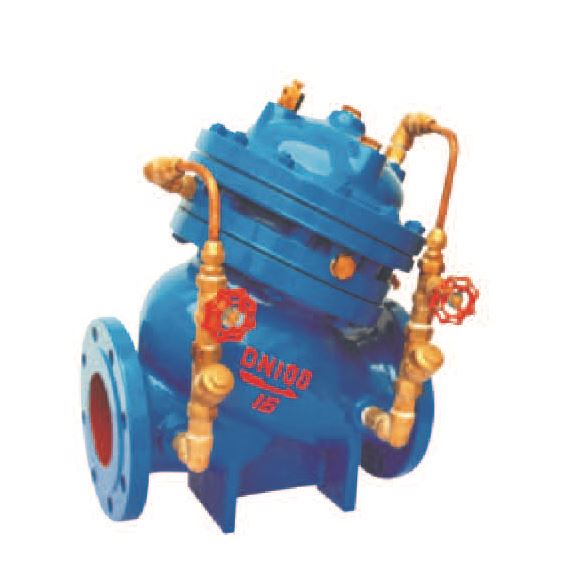 多功能水泵控制阀由主阀和调节阀及接管系统组成,阀体采用直流式阀体,主阀控制室为膜片式或活塞式的双控制室结构,控制室比一般水力控制阀增加了一个,增加了对主阀的控制功能,实现了对水泵出口的缓慢开启、全开、缓闭、截止等多功能控制,实现了一个阀门、一次调节对水泵出口的多功能控制。